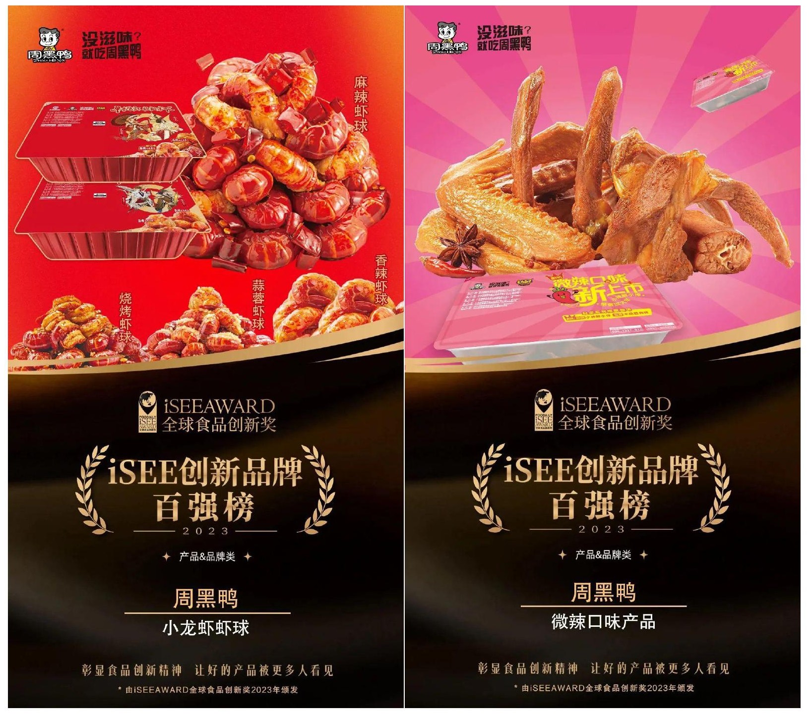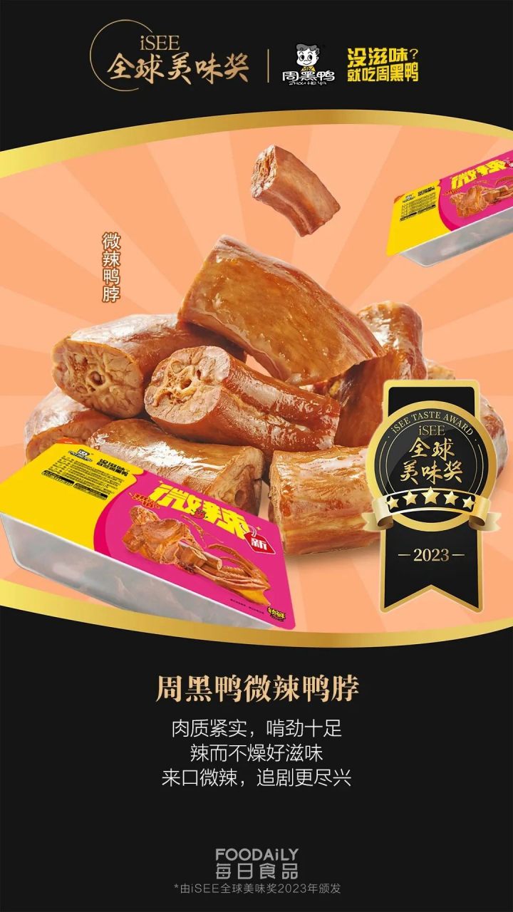不僅如此,【微辣多肉鴨鎖骨】榮獲「iSEE☆☆☆全球美味獎」,【微辣鴨翅】【小龍蝦蝦球-香辣蝦球】【小龍蝦蝦球-蒜蓉蝦球】榮獲「iSEE☆☆全球美味獎」,【周黑鴨小龍蝦蝦球】【周黑鴨微辣口味產品】榮獲「iSEE全球食品創新百強榜」。共計7項“iSEE”全球獎!